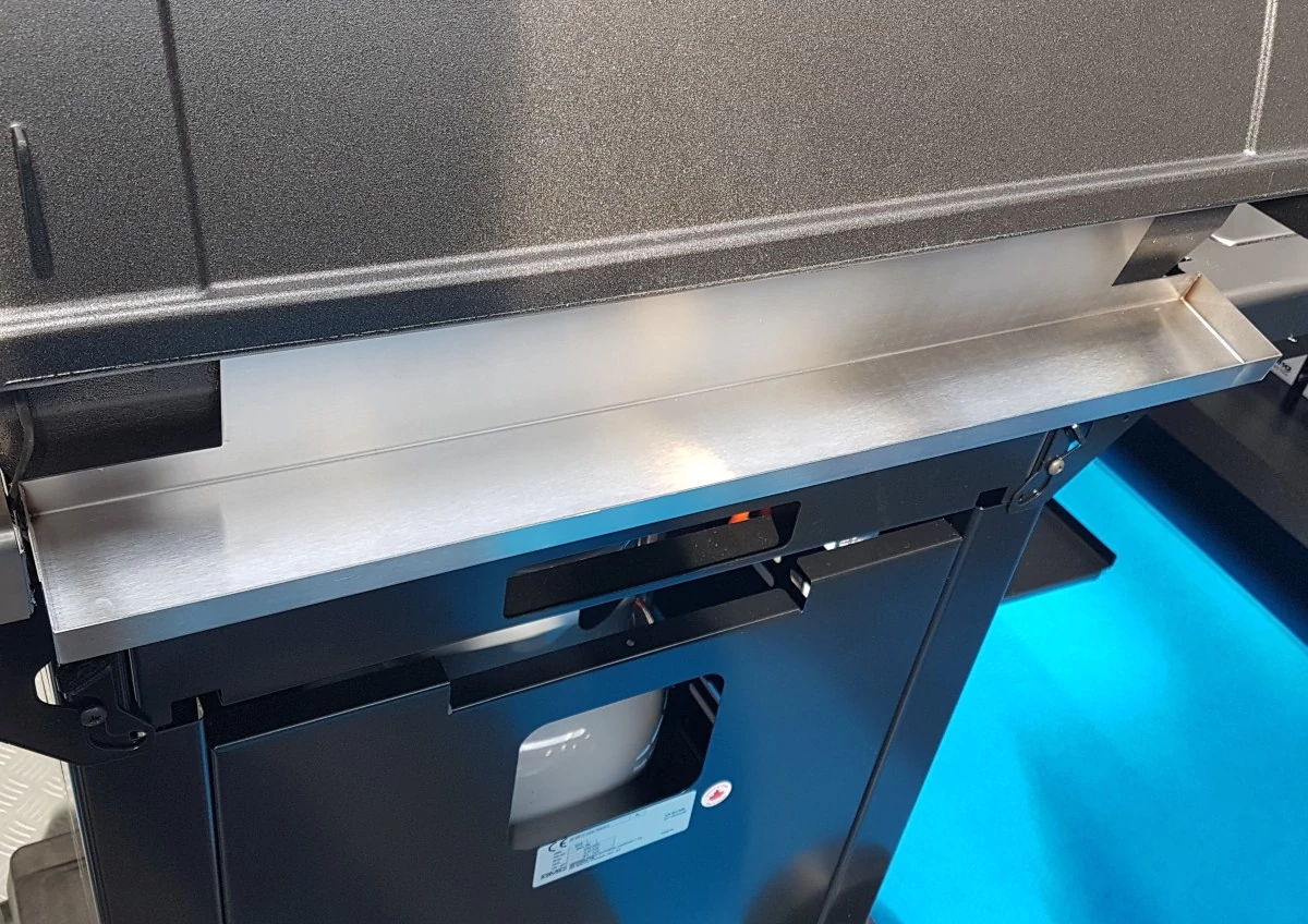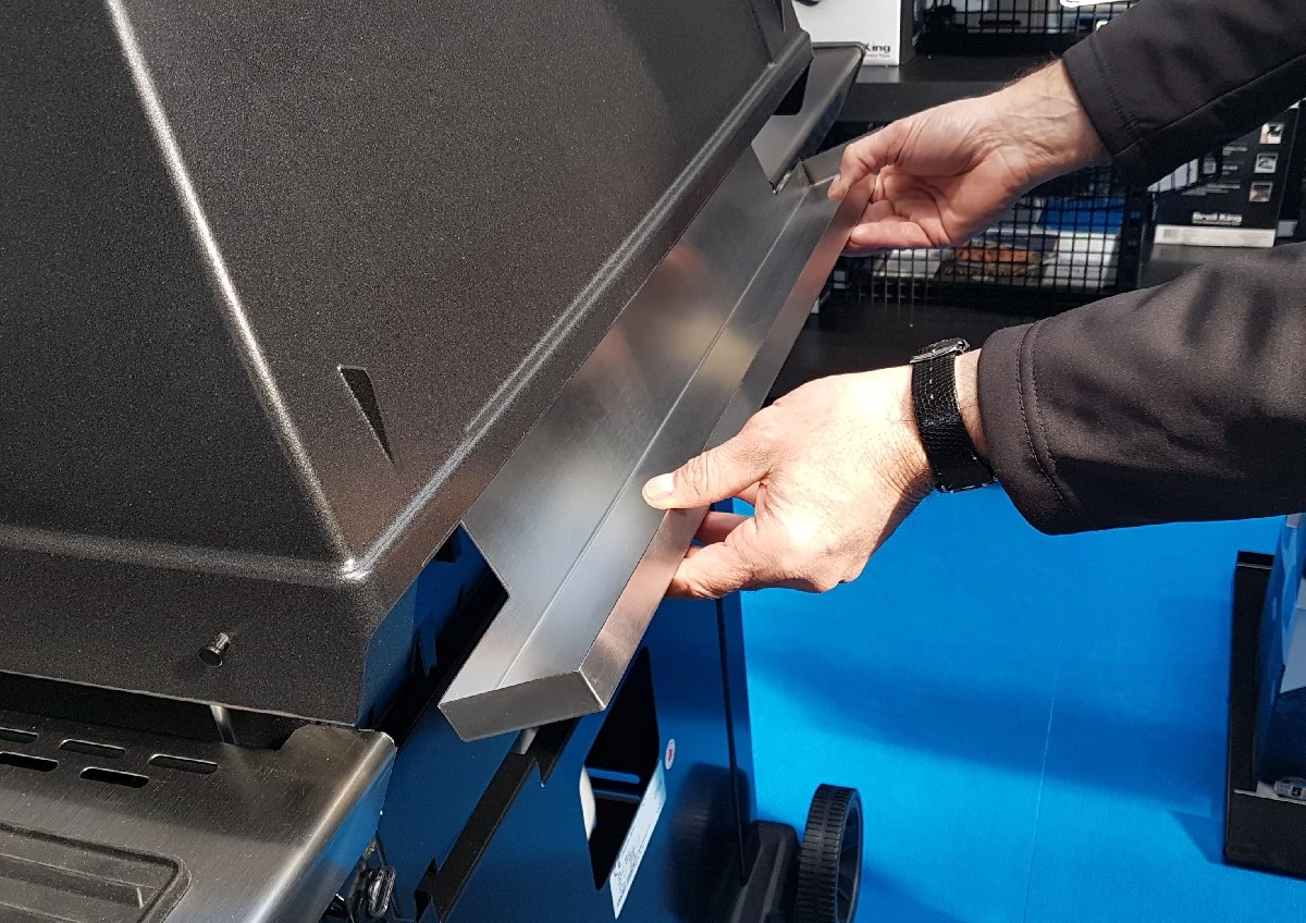 A fedél kinyitásakor a nagyméretű Broil King tárolórács hátrafelé forog, és a nyitott fedélnél az alsó ház fölé nyúlik. Ez azt jelenti, hogy a zsír, a pác, a mártás vagy más folyadék becsöpöghet a fedélbe, amikor a grill nyitva van. A fedél zárásakor vagy csukott fedélnél a maradék folyadék lefolyhat a fedél belső oldalán, és a grill mögötti padlóra csöpöghet. De a csepegtető sín felfogja ezeket a cseppeket, és megvédi a padlóburkolatot. A csepegtető sín a Broil King márka Royal, Monarch, Signet és Sovereign grillsorozataihoz kapható. A zsírsínt egyszerűen csavarozza rá a grillre, és azonnal használatja is.