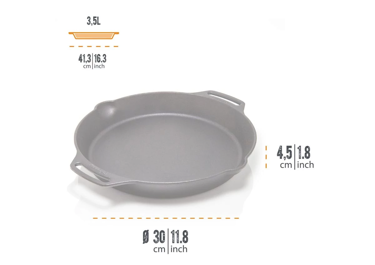A Petromax öntöttvas serpenyő, két füllel (Ø 35 cm) öntöttvas serpenyő két füllel tökéletes választás grillezéshez, sütéshez vagy pirításhoz. A 35 cm-es átmérő és az előkezelt felület kiváló hőeloszlást és könnyű tisztítást biztosít, ideális nagyobb adagokhoz.