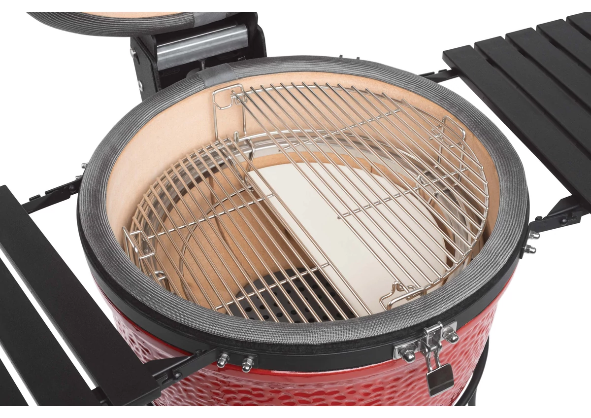 Két félhold alakú, rozsdamentes acél grillrács (46 cm átmérőjű) és kerámia deflektor kövek lehetővé teszik a közvetlen és közvetett sütési technikák egyidejű használatát. - Acél Tartóállvány: