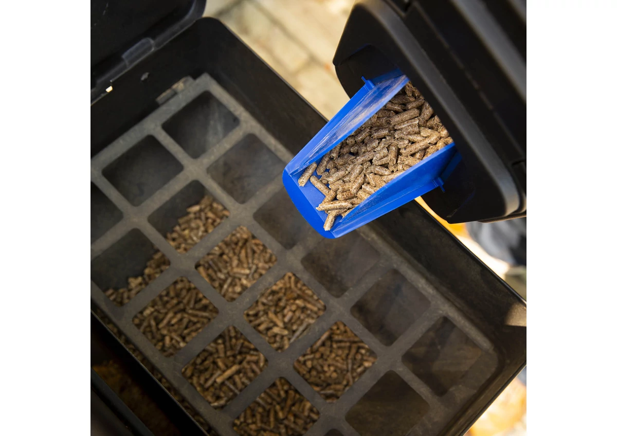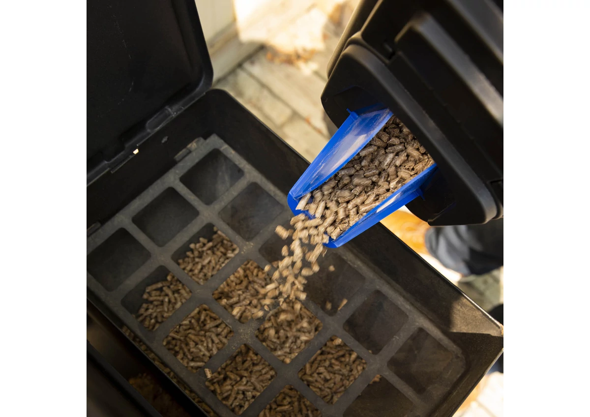 A tartály 4,5 kg pellet tárolására alkalmas. A Broil King Pellet tartó tartály fedele könnyedén kipattintható, segítségével kényelmesen és egyszerűen feltölthetjük a pellet grill garatot.