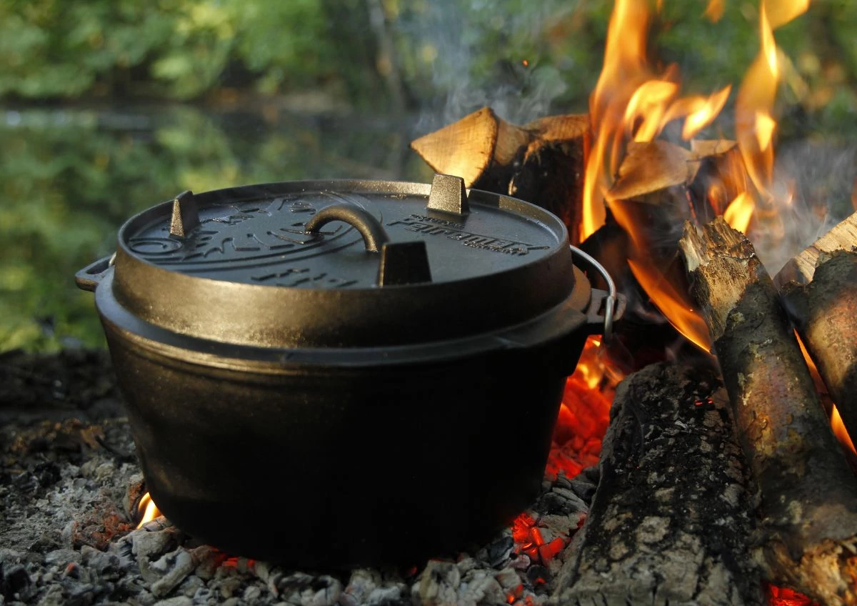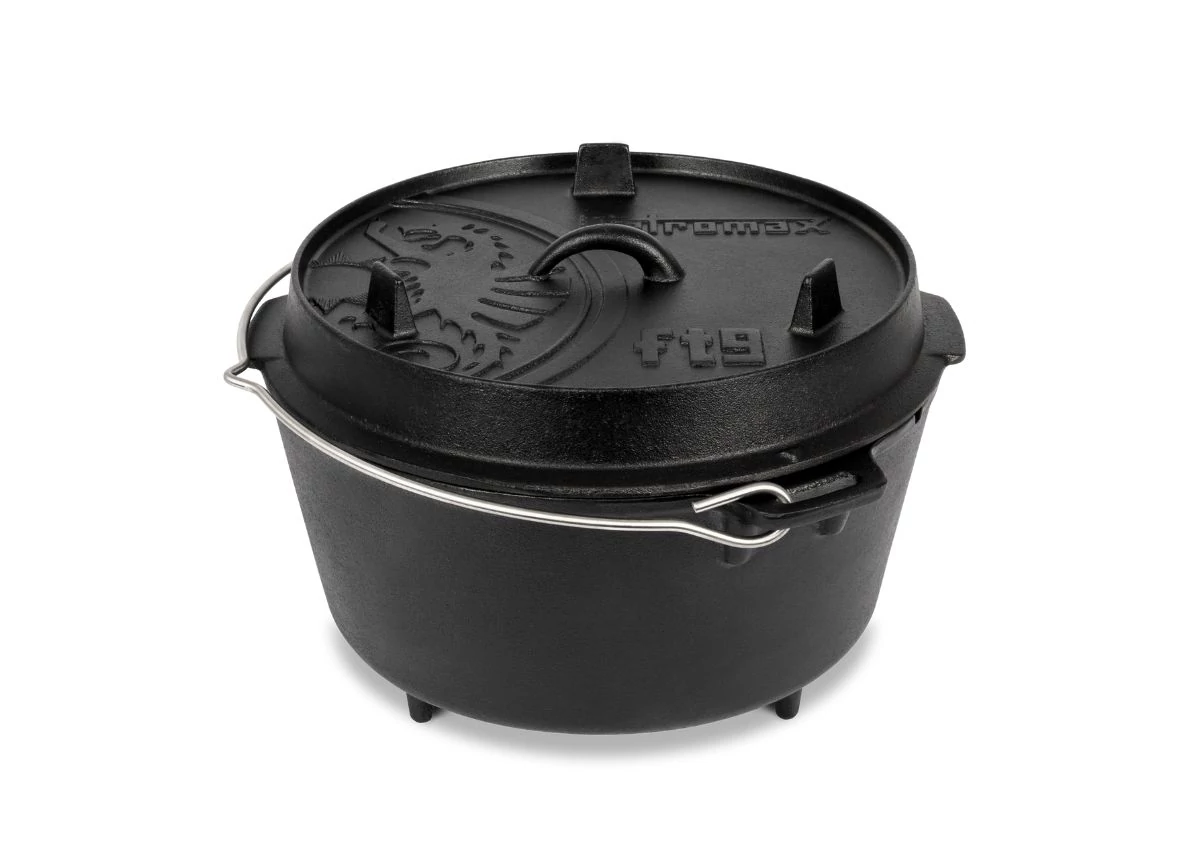 A Petromax Dutch Oven, öntöttvas lábas (8 liter, Ø 32 cm) tökéletes választás közepes adagokhoz, 4-6 főre. Az öntöttvas anyag egyenletes hőeloszlást biztosít, így ideális kenyérsütéshez, levesekhez vagy egytálételekhez. Három lába stabil tartást ad, a termométer nyílás pedig praktikus hőmérséklet-ellenőrzést kínál a fedél felnyitása nélkül.