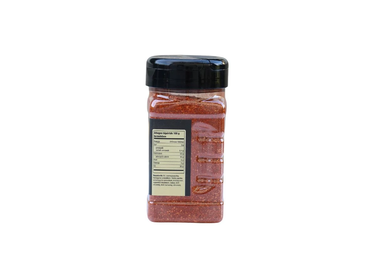 Összetevők: Só, csemegepaprika, fokhagyma-granulátum, füstös paprika, vöröshagyma-granulátum, kristálycukor, ropphantott fekete bors, zsálya, őrölt citromhéj, őrölt rozmaring, citromolaj.