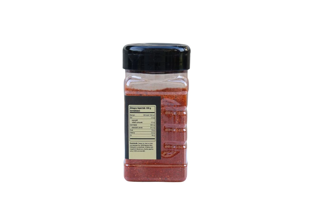 Összetevők: Tengeri só, barna cukor, csemegepaprika, vöröshagyma dara, fokhagyma-granulátum, kristálycukor, roppantott fekete bors, füstös paprika, curry, őrölt szeresendió.